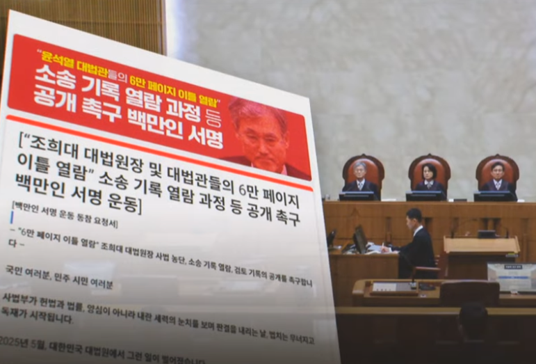 최근 온라인과 시민사회에서 조희대 대법원장 탄핵 서명운동이 뜨겁게 확산되고 있습니다. 법의 수호자라 불리는 대법원장의 탄핵 요구는 결코 가볍지 않은 일입니다. 단 이틀 만에 6만 페이지를 검토가 가능한지 의문입니다.