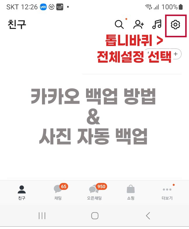 - 카카오톡 실행 → 우측 상단 '톱니바퀴' → 설정 클릭