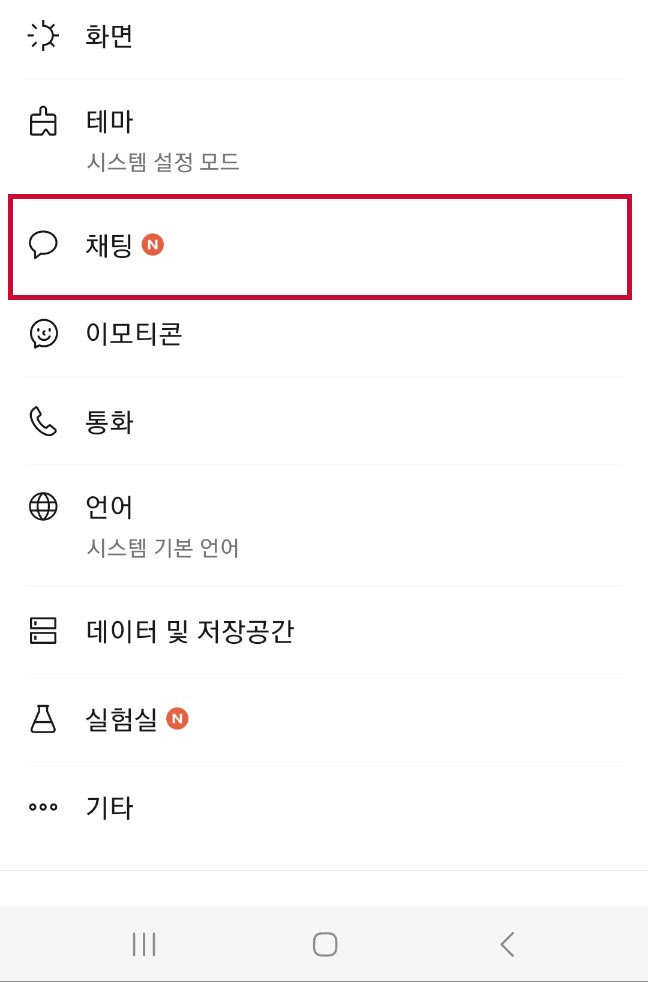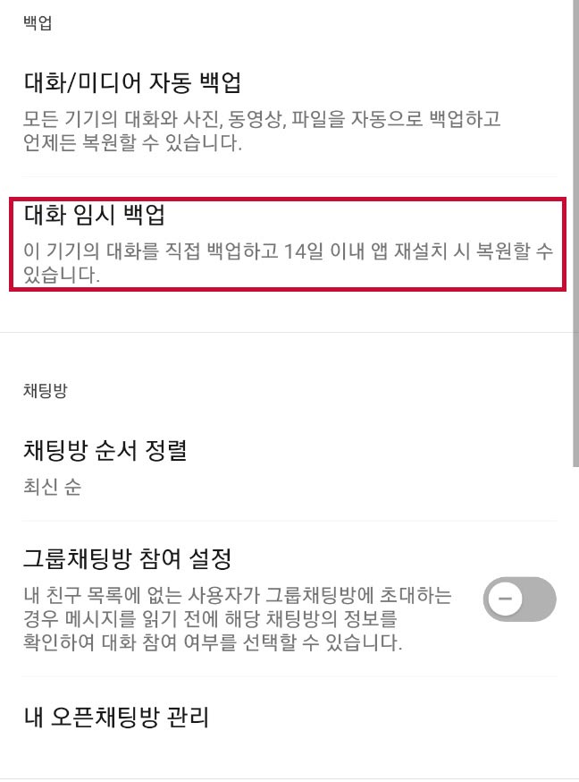 2. '채팅' → '대화 백업' 선택(사진백업이 필요없다면 '대화임시백업' 선택)
