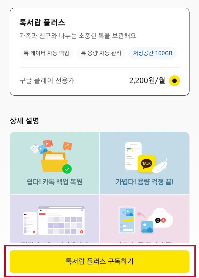 톡서랍 플러스는 카카오에서 제공하는 유료 보관 서비스입니다. 일반 백업보다 훨씬 유용합니다. 사진, 파일, 링크, 대화 등 모든 데이터를 자동으로 보관해줍니다. 특히 업무용, 가족 단톡방처럼 사진을 보관하기에 좋습니다.